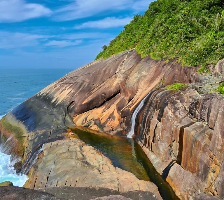 Se você busca aventura em meio à natureza, a Cachoeira do Saco Bravo é um passeio imperdível! Considerada a mais famosa da região, ela se destaca por sua beleza única – uma queda d’água que forma uma piscina natural em meio às rochas e deságua diretamente no mar. Um verdadeiro espetáculo da natureza!