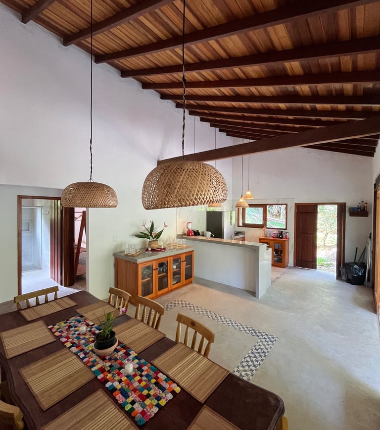 Uma área ampla com uma mesa gigante, ótima pra reunir todo mundo pra comer, conversar e curtir.